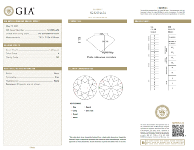 GIA, 2025, Report No. 5232594476, 1.68 carats, K color, SI1 clarity, No fluorescence