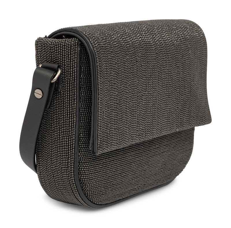 Crossbody flap bag in monili bead-embellished grey leather with matte silver-tone hardware. Magnetic closure and adjustable & removable grey leather strap.