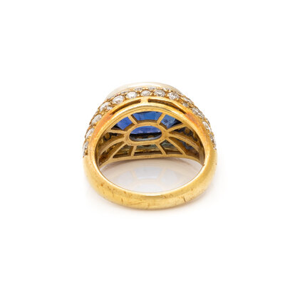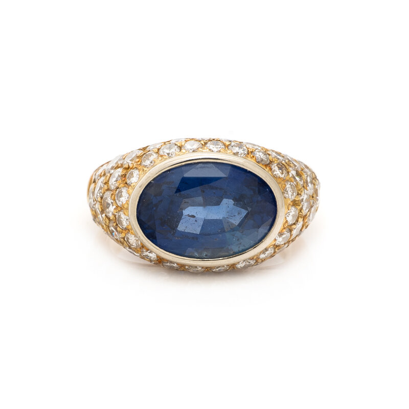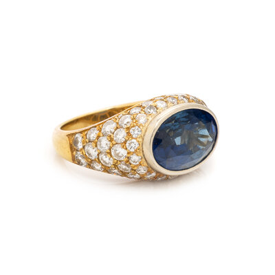 Oval sapphire weighing approximately 5.00 carats by formula, and round diamonds weighing approximately 1.75 carats total. 18 karat yellow gold. Ring size 5 3/4.
