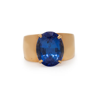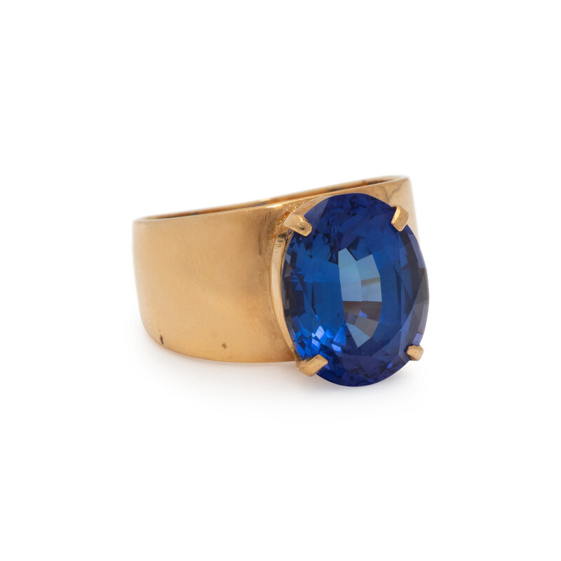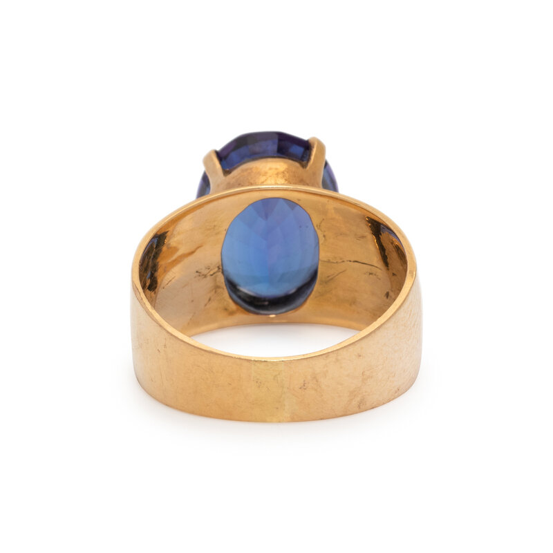 Oval tanzanite weighing approximately 5.90 carats by formula. Yellow gold. Ring size 7 1/4.