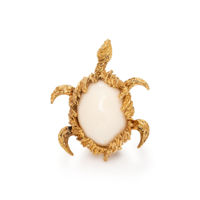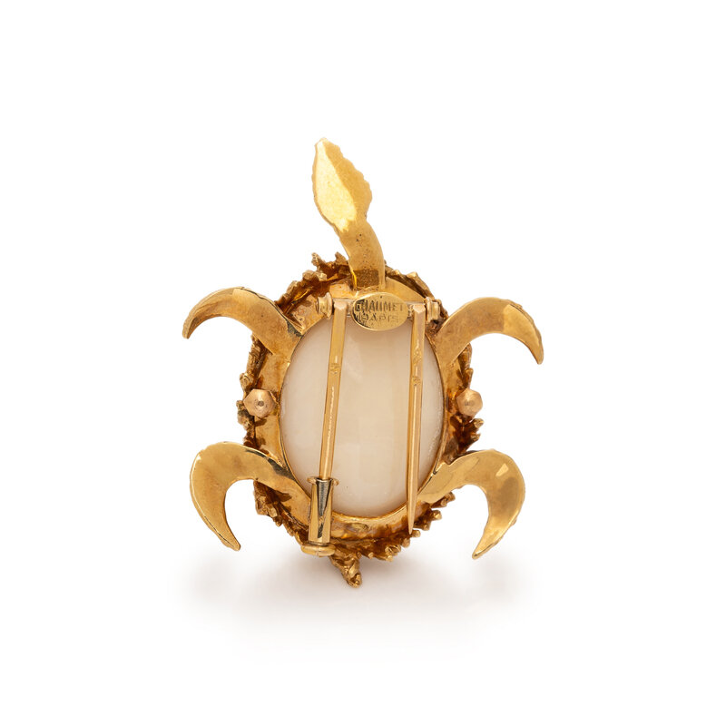 CHAUMET, YELLOW GOLD AND ANGEL SKIN CORAL TURTLE BROOCH