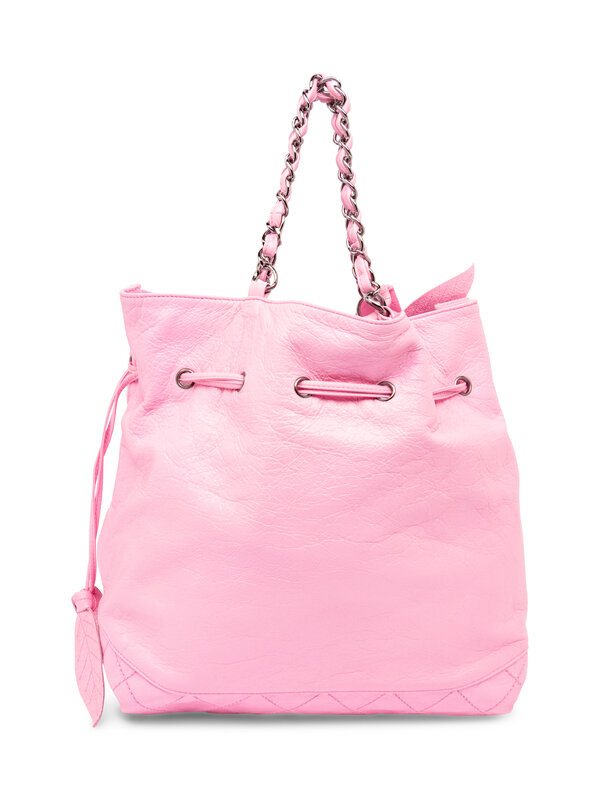 Chanel large drawstring tote bag in glazed bubblegum pink leather with silver-tone hardware. Drawstring closure and interwoven leather-metal chain strap.