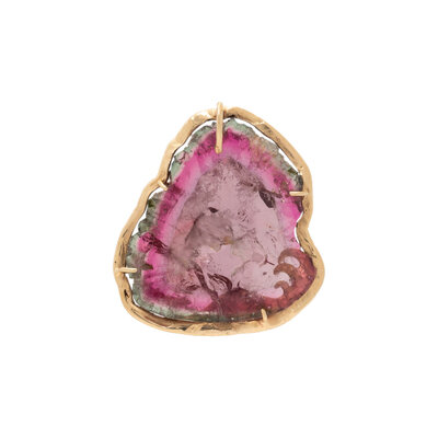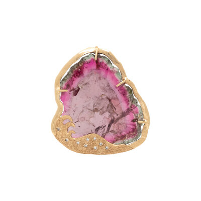 Flat freeform watermelon tourmaline slice measuring approximately 48.40 x 45.35 mm and round diamonds. Yellow gold. 2 1/8 x 2 inches.