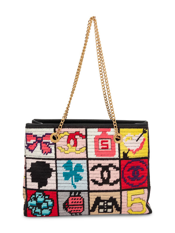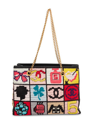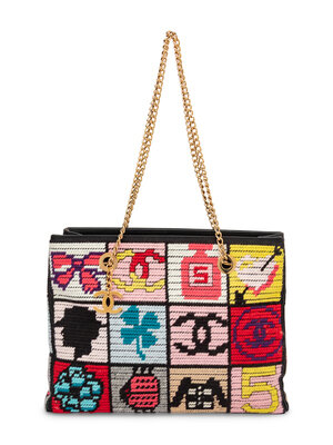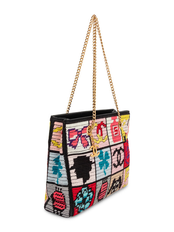 Chanel Precious Symbols Needlepoint bag in multicolor cotton thread needlepoint and black leather with gold-tone hardware. Metal chain straps with dangling CC charm.