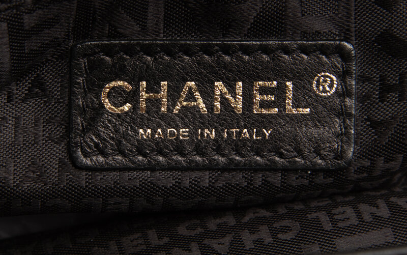 Additional Details: black silk jacquard lining, two main interior compartments with zippered pocket divider, one interior sidewall zipper pocket, metal protective feet at base.