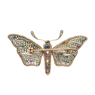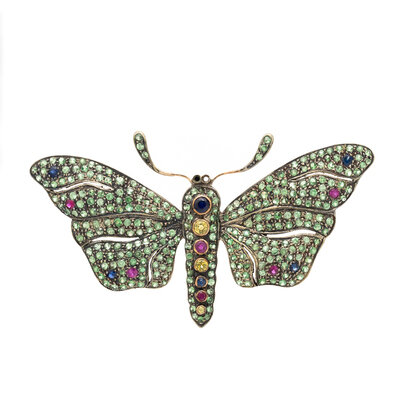 Round ruby, sapphire, and yellow sapphire, and round green stones. Silver-topped yellow gold. 3 x 1 3/4 inches.
