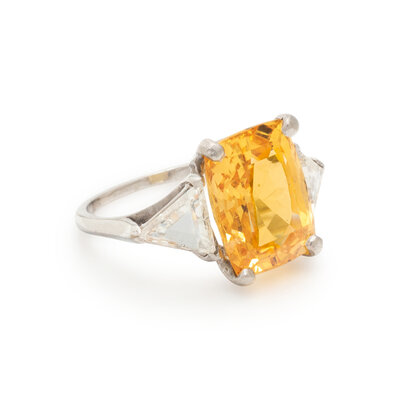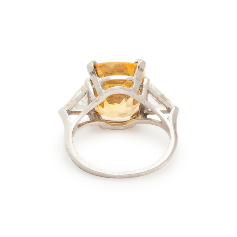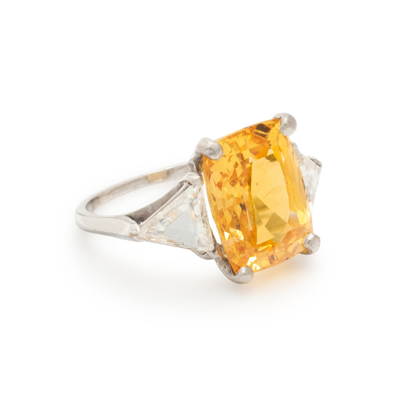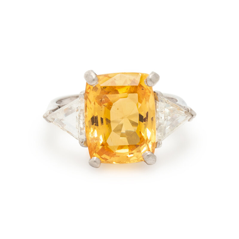 Cushion cut yellow sapphire weighing approximately 8.90 carats by formula, and two triangular cut diamonds weighing approximately 1.00 carat total. Platinum. Ring size 6.