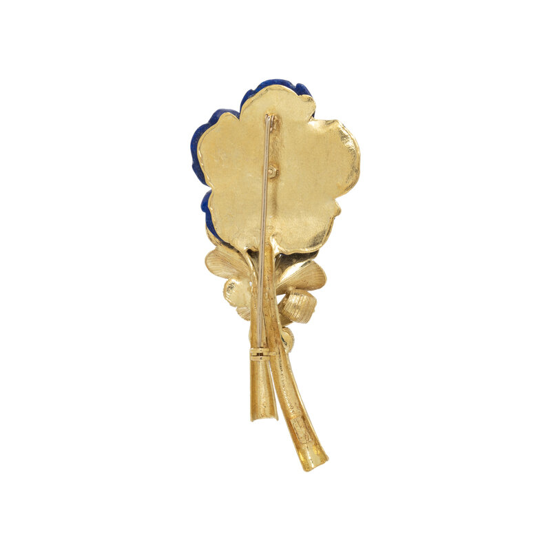 Carved lapis lazuli flower centered by a round cabochon emerald. 18 karat yellow gold. 3 1/8 x 1 1/2 inches.