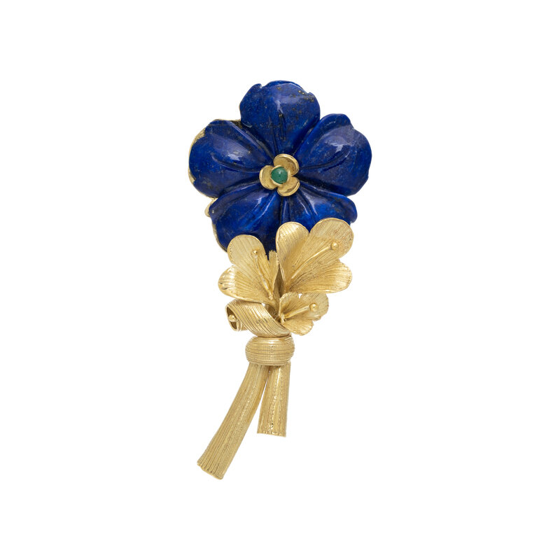 LAPIS LAZULI, EMERALD, AND YELLOW GOLD FLOWER BROOCH