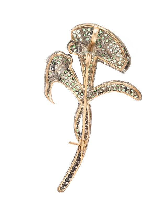 Round green stones, and rose cut diamonds. Silver-topped yellow gold. 3 x 1 3/4 inches.