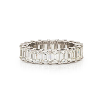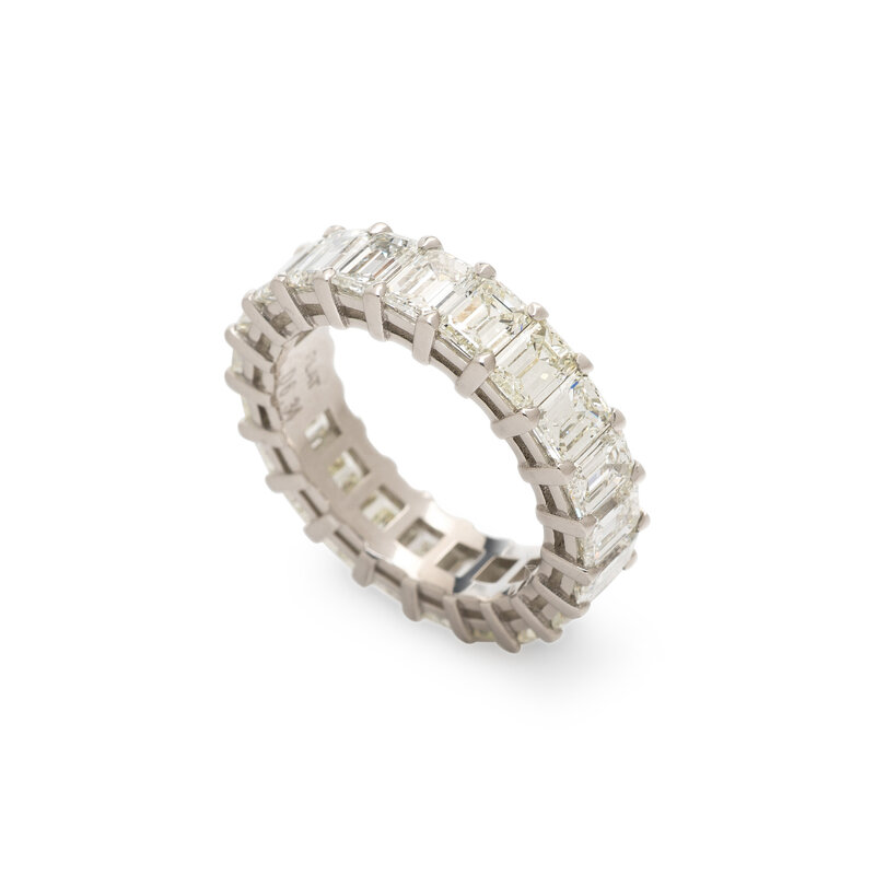 Twenty-one emerald cut diamonds weighing approximately 6.34 carats total. Platinum. Ring size 6 1/4.