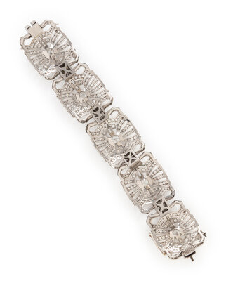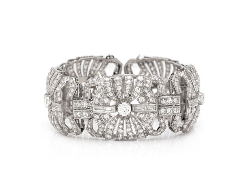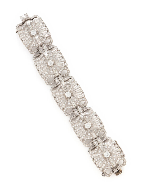 Round, single, and baguette cut diamonds weighing approximately 16.00 - 18.00 carats total. Platinum. 7 inches long, 1 1/8 inch wide.