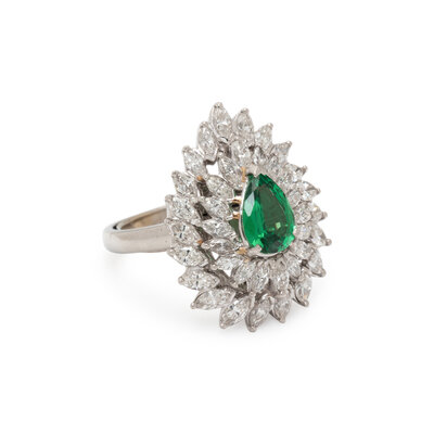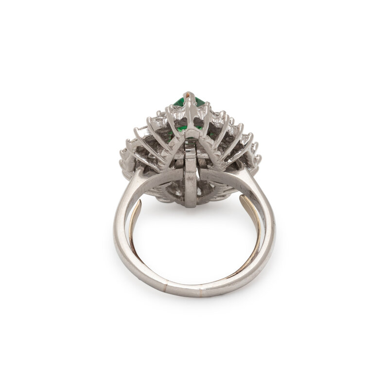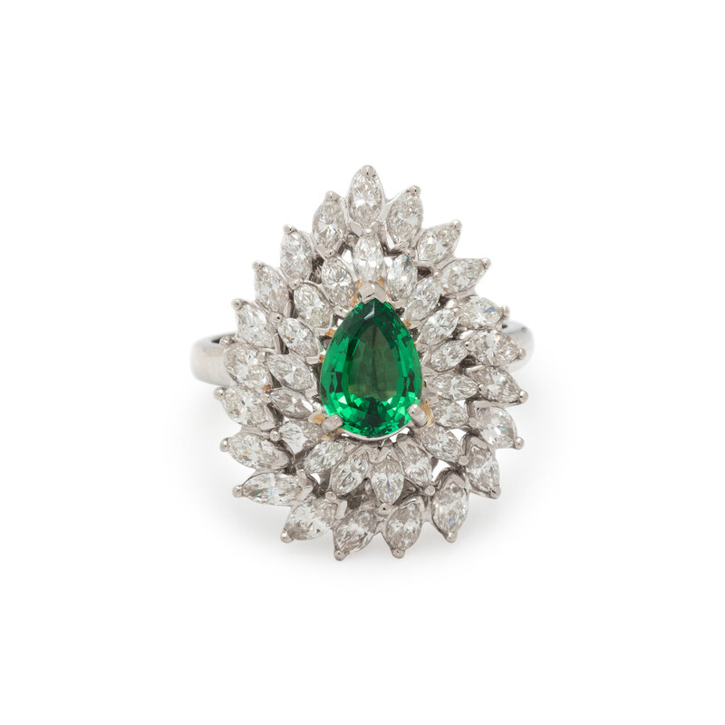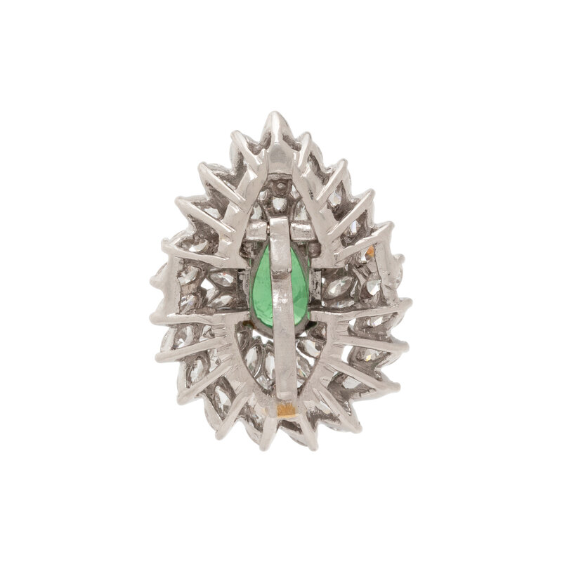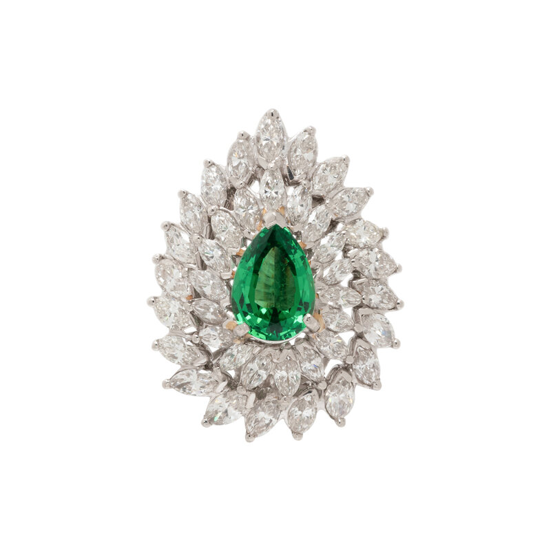 Pear shaped tsavorite garnet weighing approximately 1.25 carats by formula, and marquise cut diamonds weighing approximately 3.50 carats total. Platinum. Ring size 7. Pendant: 1 inch long.