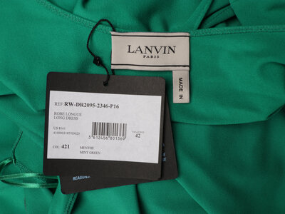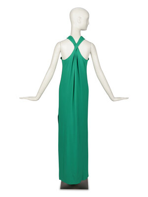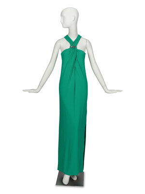 Halter-neck shift gown in kelly green viscose/elastane-blend jersey knit. Moderate stretch content. Draped & twisted neckline with rhinestone details at front. Mid-thigh-high slit at side seam. Unlined.