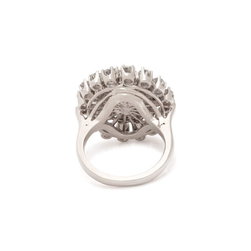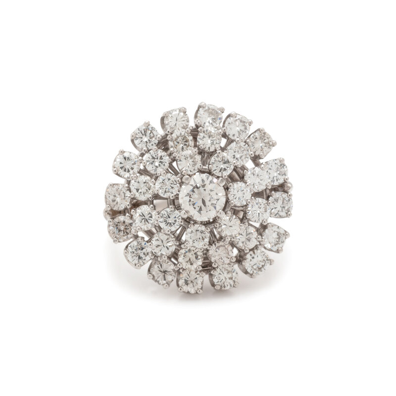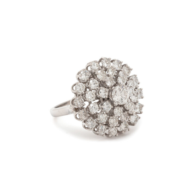 Round diamonds weighing approximately 3.00 carats total. White gold. Ring size 4 3/4.