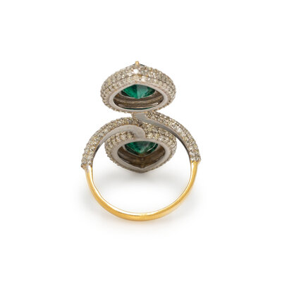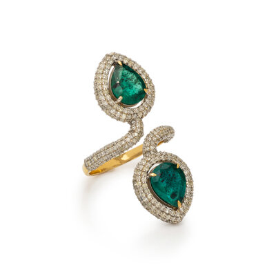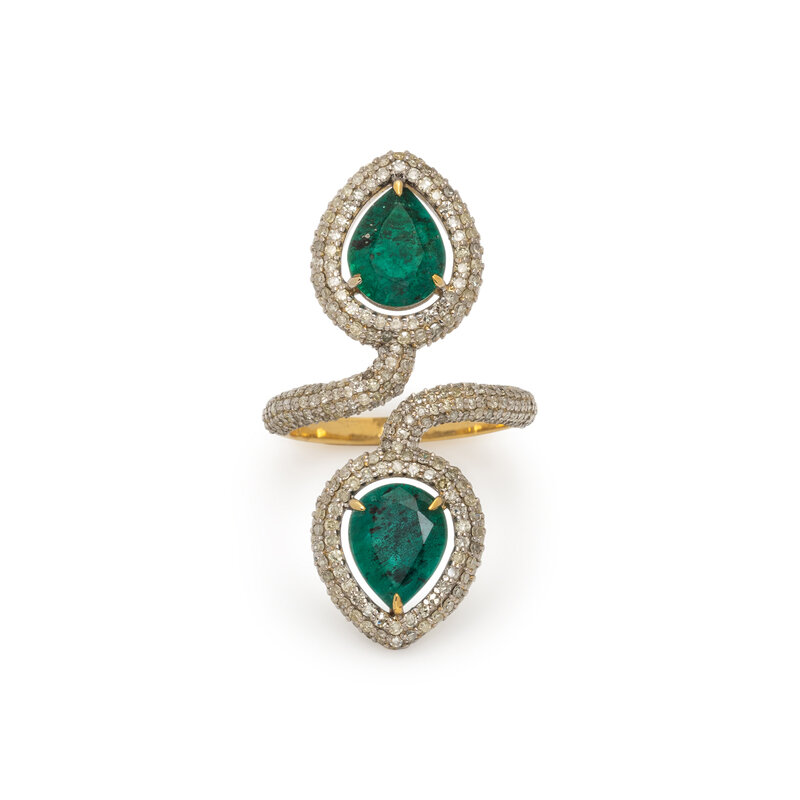 Pear shaped emeralds weighing approximately 3.50 carats total by formula, and round and single cut diamonds weighing approximately 2.00 carats total. Yellow gold and silver. Ring size 8 1/4.