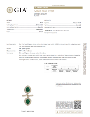 GIA, 2025, Report No. 6237566977, Natural Beryl, Emerald, Brazil, Clarity Enhanced (F2), Moderate Clarity Enhancement