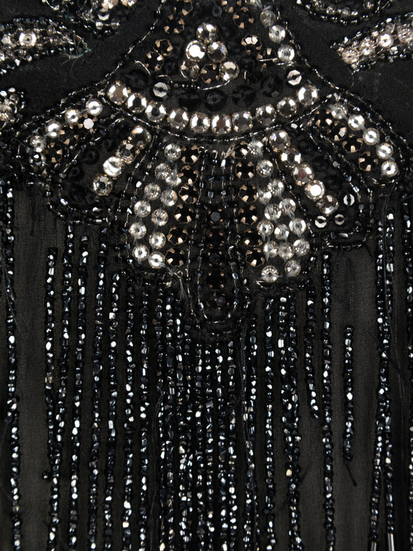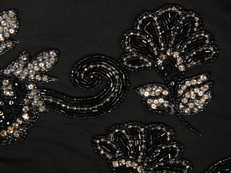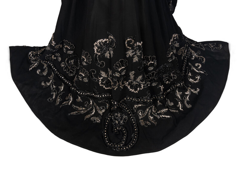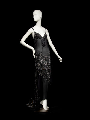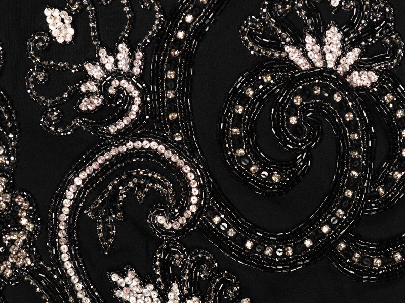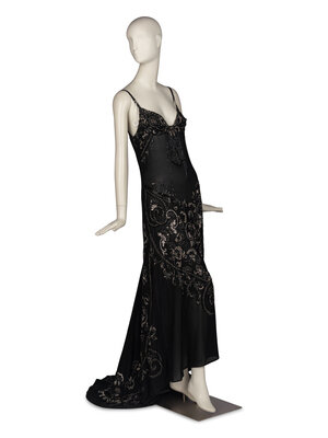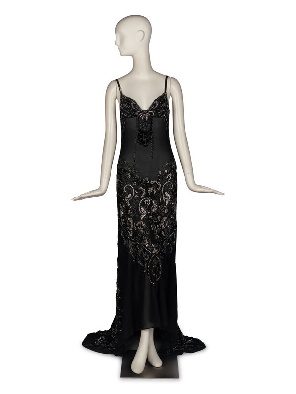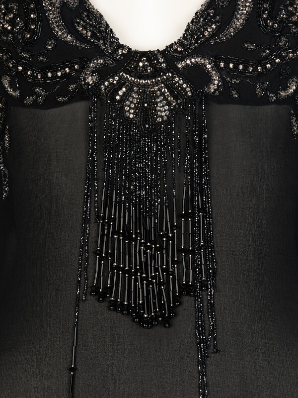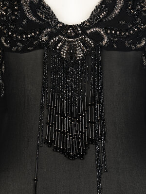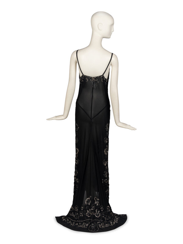 Spaghetti-strap floor-length gown in embellished black silk chiffon. V-neckline. Bias cut skirt. Beading embellishments throughout, hanging strands of beads at center of chest. Slight train at back hem. Zipper closure at side. Unlined.