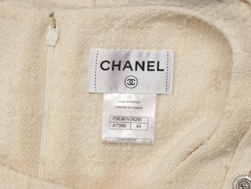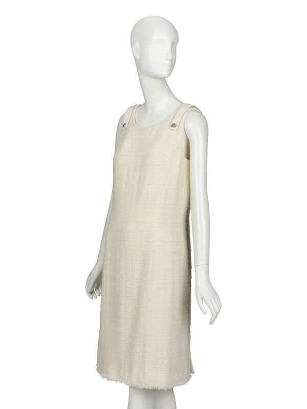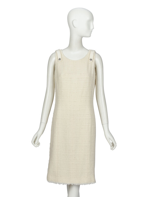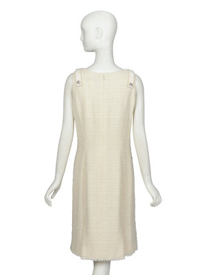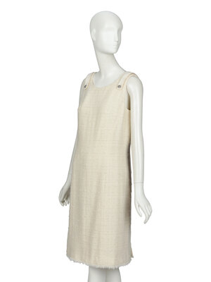Sleeveless shift dress in cream wool/nylon/mohair-blend bouclé tweed. Round scoop neckline. Decorative buttoned grosgrain strap details. Frayed edge at skirt hem. Invisible zipper and hook-and-eye closures at back. Fully lined in cream silk jacquard.