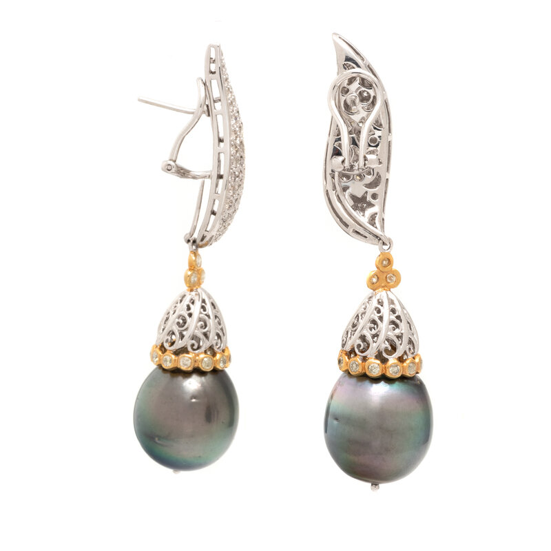 Gray cultured pearls measuring approximately 18.00 x 15.80 mm (origin of color not tested), and round diamonds weighing approximately 2.75 carats total. 18 karat white and yellow gold. 2 1/2 inches long.