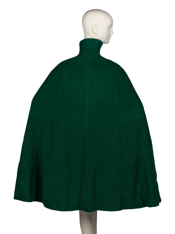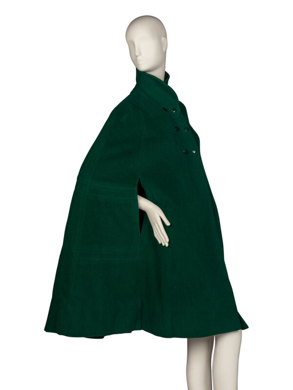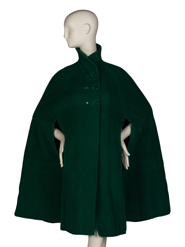 Cape in emerald green felted wool. Slits for armholes at sides. Double breasted button closure at upper chest. Small, round shawl collar. Midi length. Lined in brown silk.