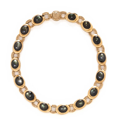 BLACK STAR SAPPHIRE, DIAMOND, AND YELLOW GOLD NECKLACE