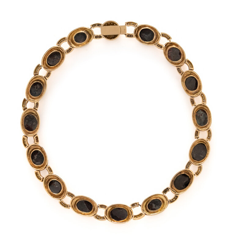 Oval cabochon black star sapphires measuring approximately 12.50 x 10.75 mm and round brown diamonds (origin of color not tested) weighing approximately 1.20 carats total. 14 karat yellow gold. 15 inches long.