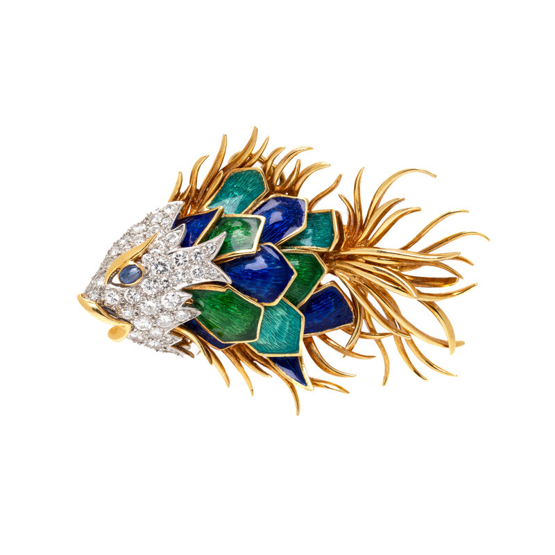 DIAMOND, SAPPHIRE, AND ENAMEL FISH BROOCH
