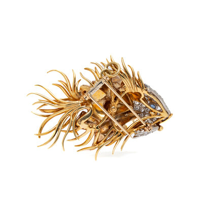 Blue and green enamel, round diamonds, and one oval cabochon sapphire. Yellow and white gold. 2 1/4 x 1 1/2 inches.