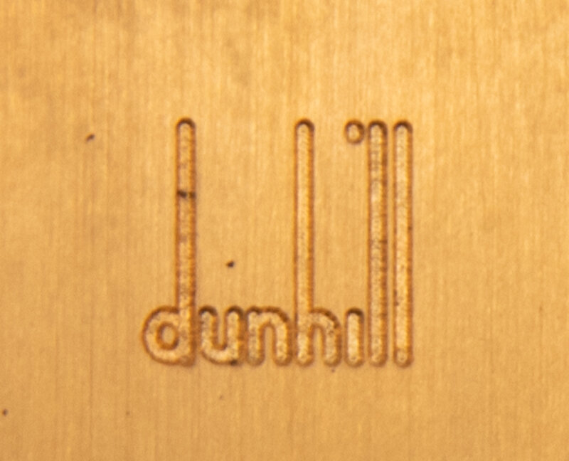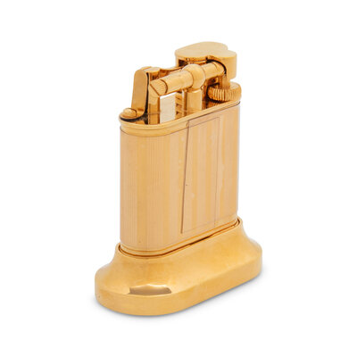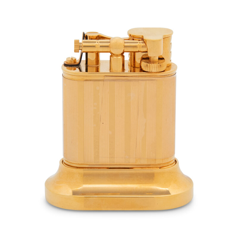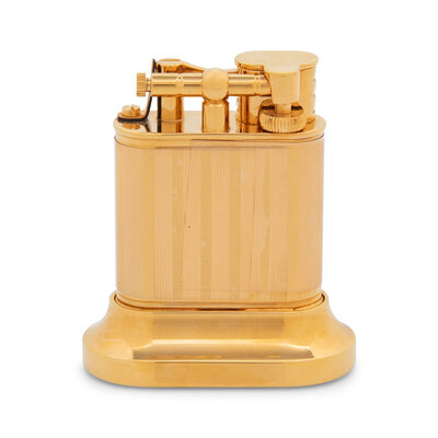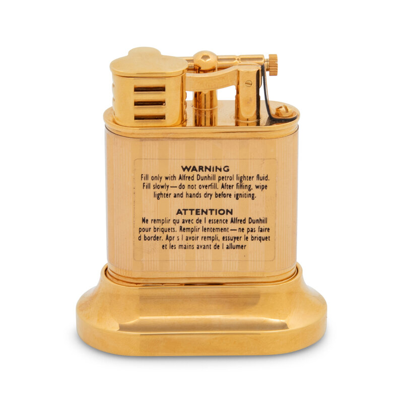 A gold-tone metal lift-arm "Unique Club" table lighter by Alfred Dunhill. Comes with black leather Dunhill box.