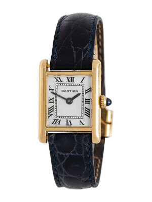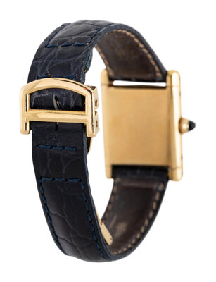 Bracelet/Strap: Navy leather with 18K yellow gold Cartier New York deployant clasp