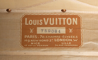 Label: "LOUIS VUITTON / PARIS. 70, CHAMPS-ÉLYSÉES / 149, NEW BOND ST. LONDON. W / NICE 12. AVE DE VERDUN / LILLE 34 RUE FAIDHERBE"