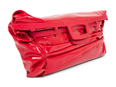 Crumpled-effect clutch bag in cherry red vinyl with red leather details.