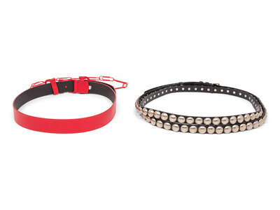 Belt in red calfskin leather with red painted hardware. Features X-logo belt buckle and removable paper clip hanging chain.