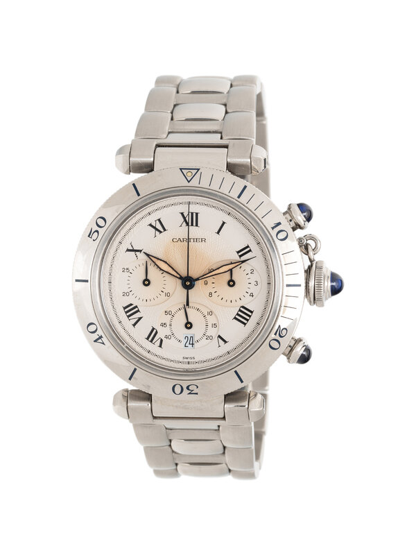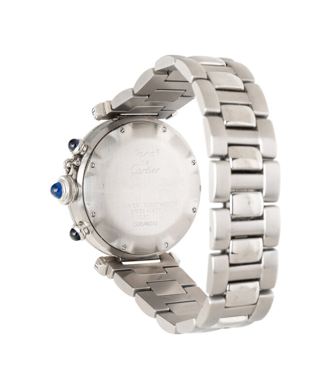 Stamps: Case back: Pasha de Cartier WATER RESISTANT SWISS MADE 1050 1 CO54650. Clasp: SWISS MADE Cartier STAINLESS STEEL.