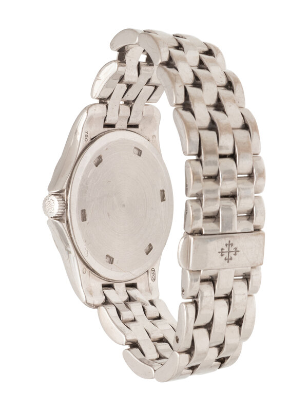 Stamps: Case back: PPCo 750 (Swiss hallmark). Clasp: PATEK PHILIPPE GENEVE 750 (Swiss hallmark).