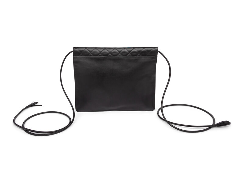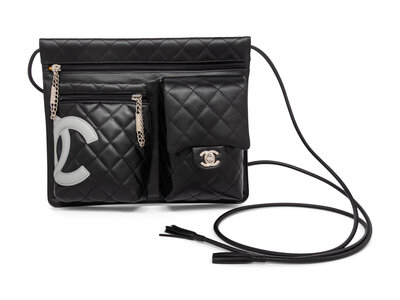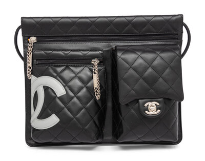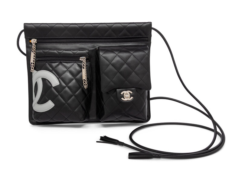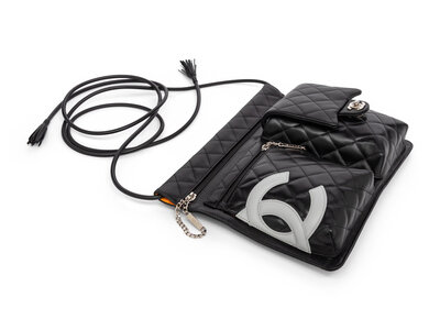 Ligne Cambon crossbody/shoulder bag in quilted black calfskin leather with silver-tone hardware. Zipper closure and adjustable tie-cord straps.
