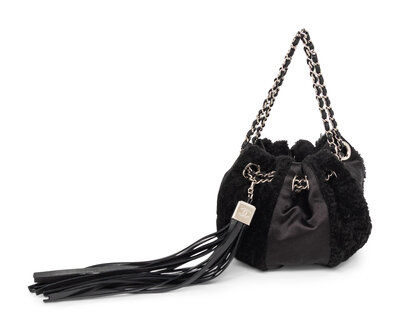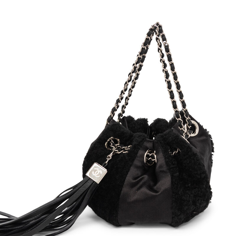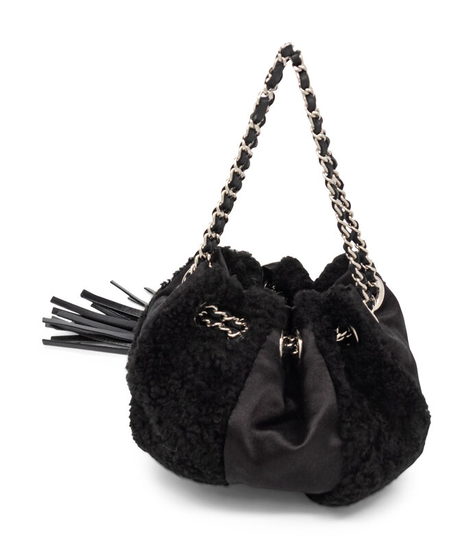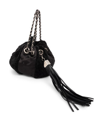 Pouch evening bag in pieced black chenille tweed and black satin with silver-tone hardware. Interwoven leather-metal chain strap / drawstring closure.
