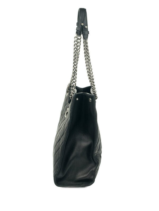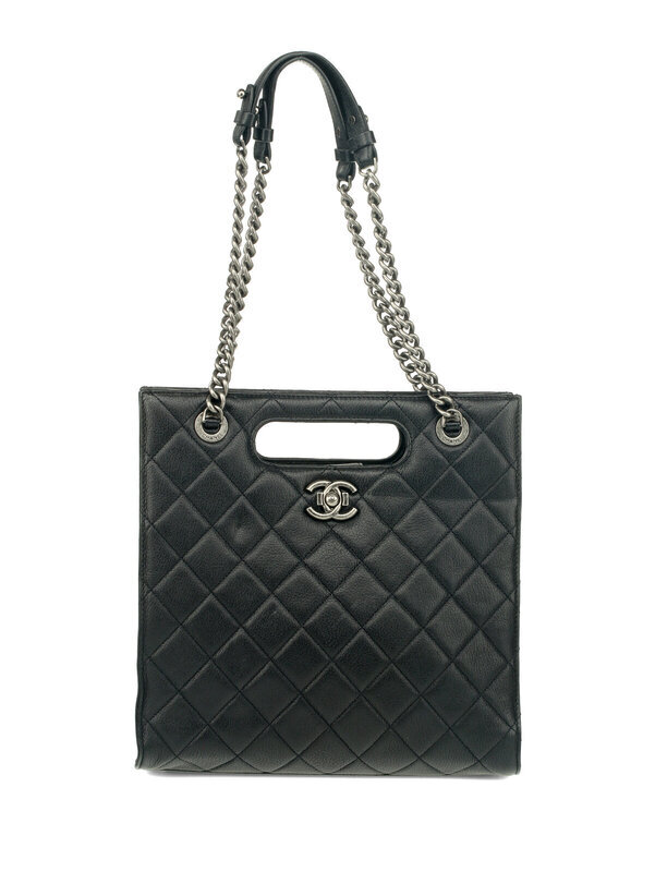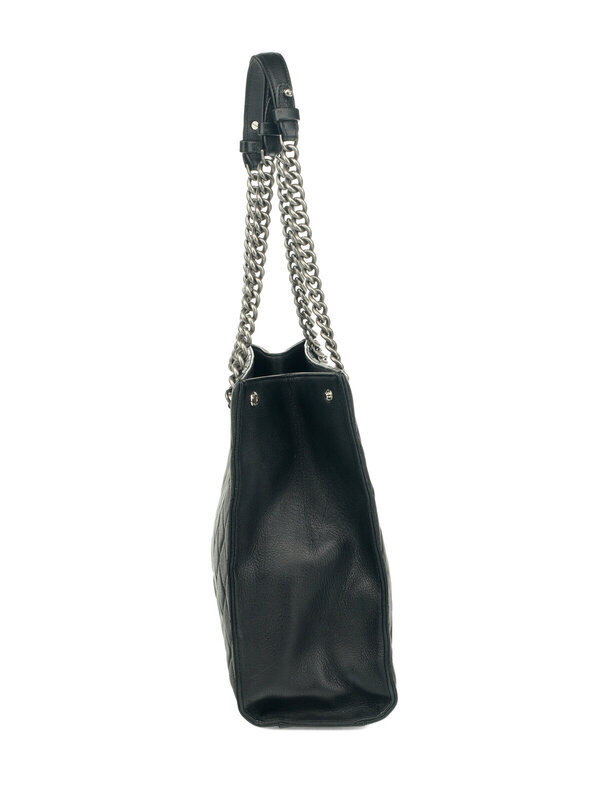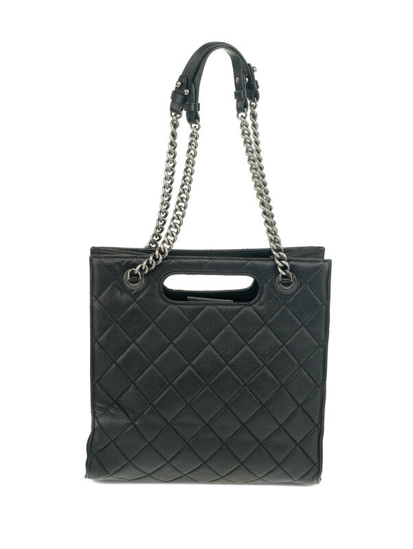 Chanel Boy Shopper Tote in Quilted Black Caviar Leather with Aged Silver-Tone Hardware. CC Push-Lock Closure and Chain and Leather Strap.