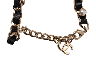 Choker necklace in champagne gold-toned metal, black leather, and faux pearls. Features 'CHANEL' engraved nameplate on a black leather-metal interwoven chains studded with faux-pearl beads. Lobster clasp closure at back.