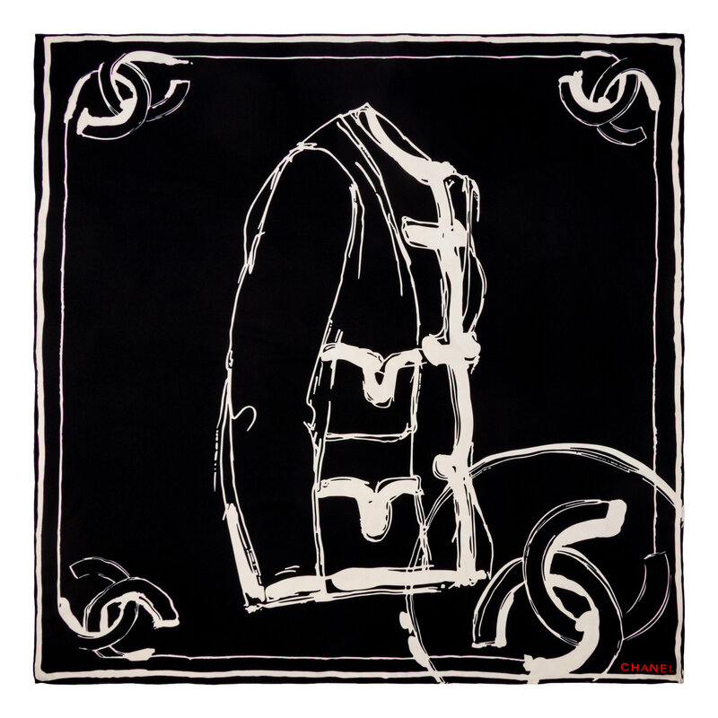 Large scarf/shawl in printed silk twill; features an illustrated jacket & CC logo print. Features rolled and hand-stitched edges. Includes box.