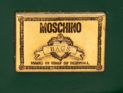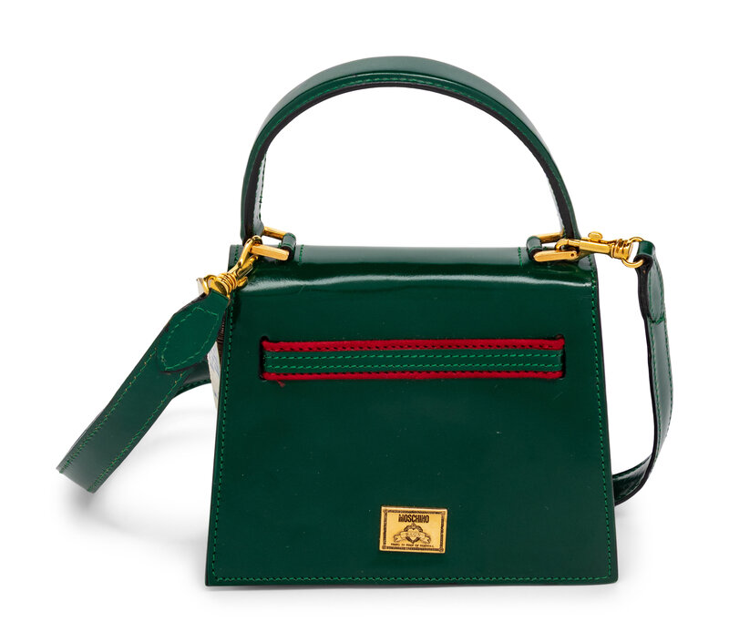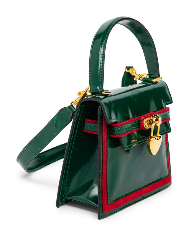 Mini handbag/shoulder bag in green glazed leather and red wool felt with gold-tone hardware. Turn-lock toggle closure with heart-shaped faux padlock, flat leather handle, and removable flat leather shoulder strap.