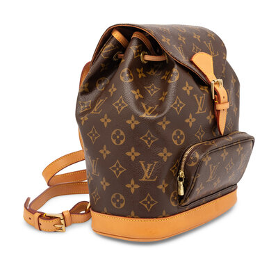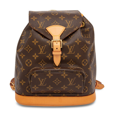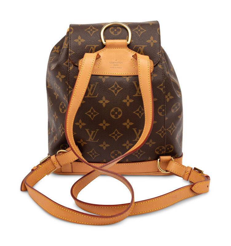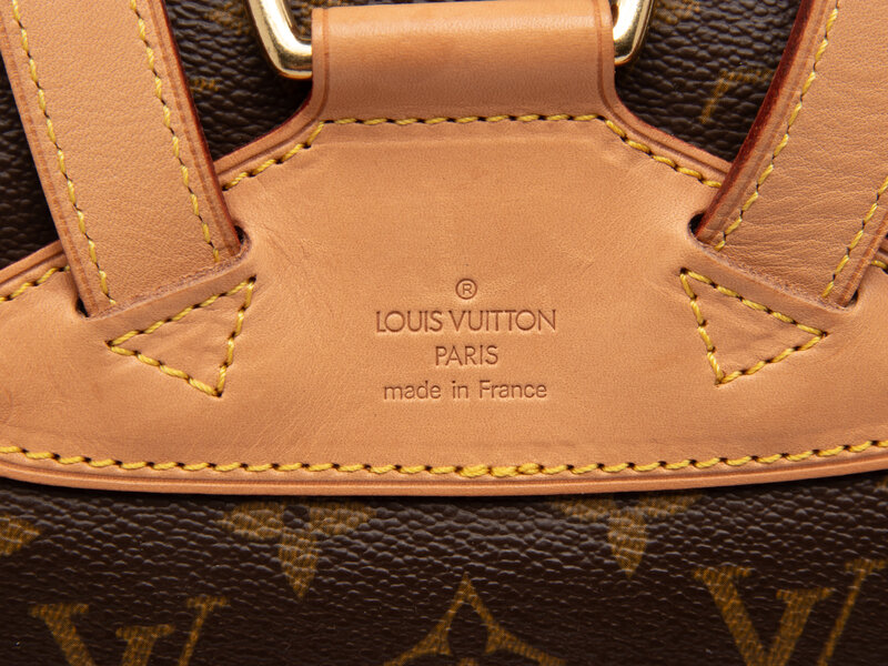 Montsouris backpack in monogram coated canvas and vachetta leather with gold-tone hardware. Drawstring & buckled flap closures and adjustable leather backpack straps.