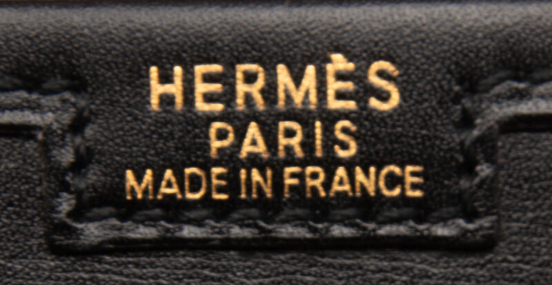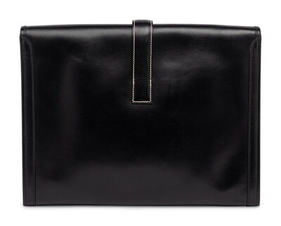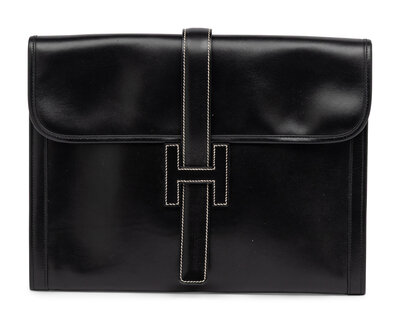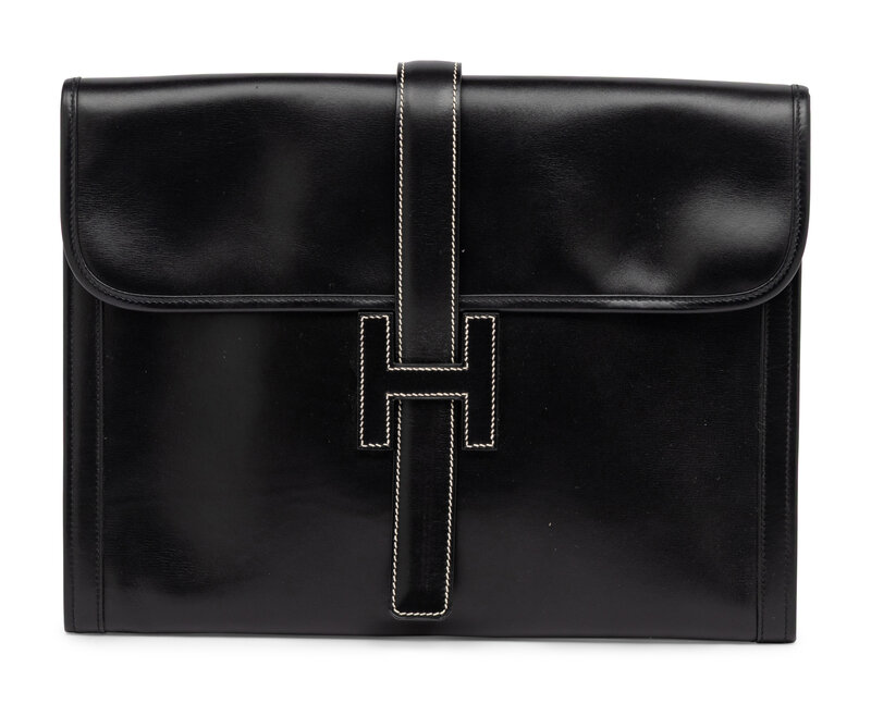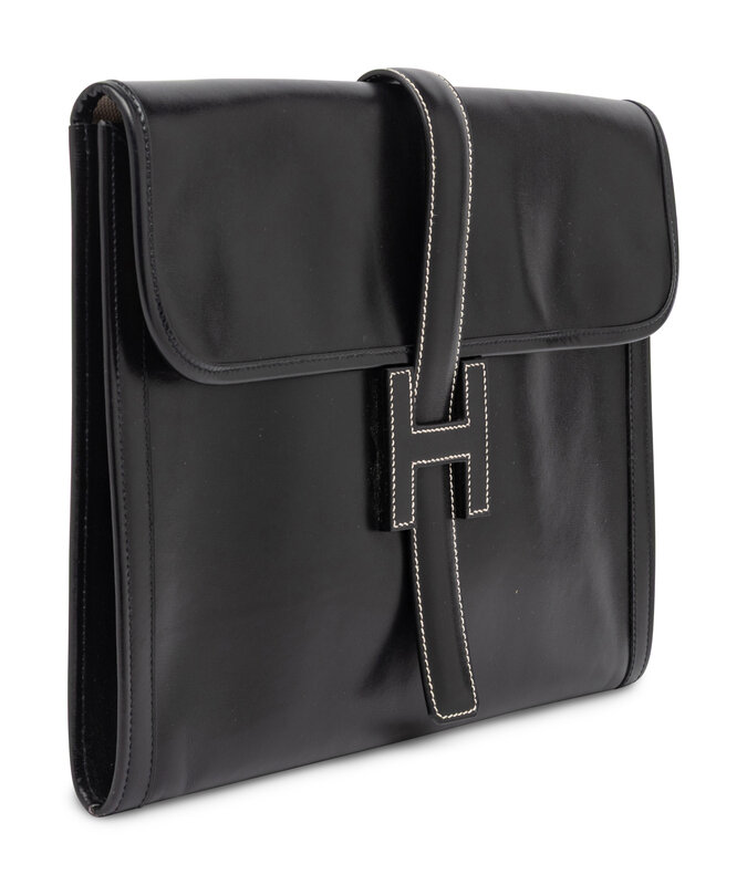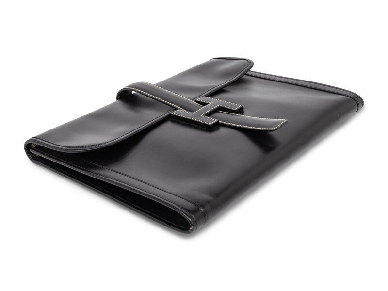 Hermès Jige 34 clutch in Noir Box leather with white saddle stitching details.