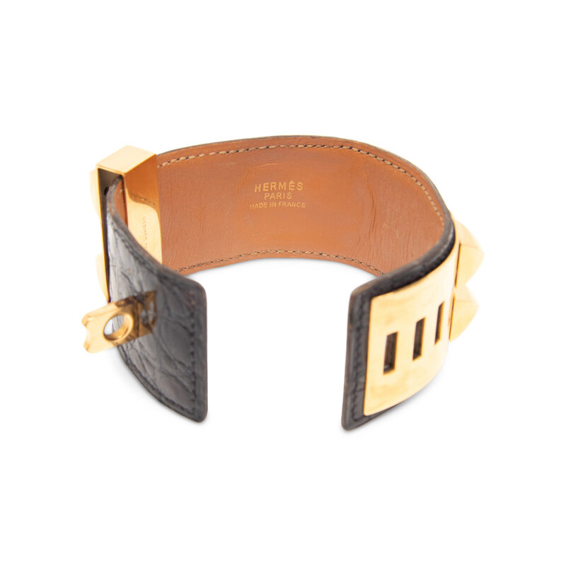'Collier de chien' cuff bracelet in black crocodile with gold-plated hardware, lined in brown leather. Features medor studs, ring, and adjustable closure.