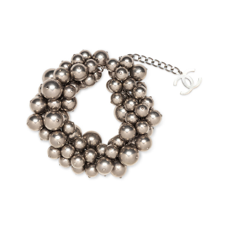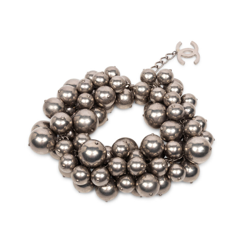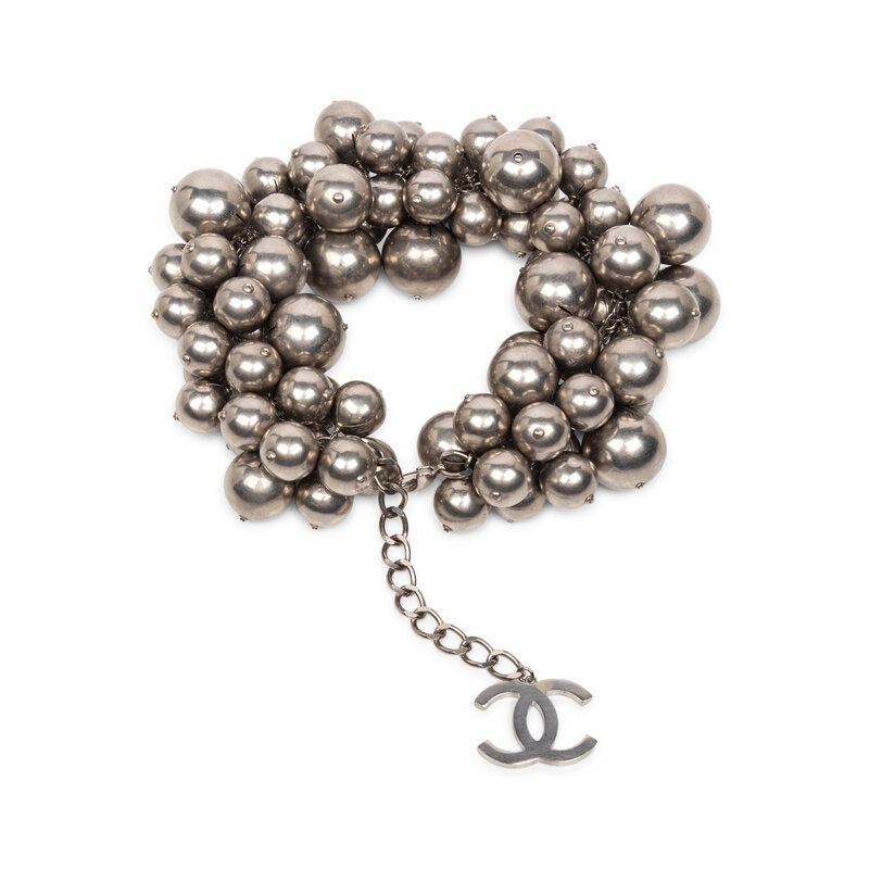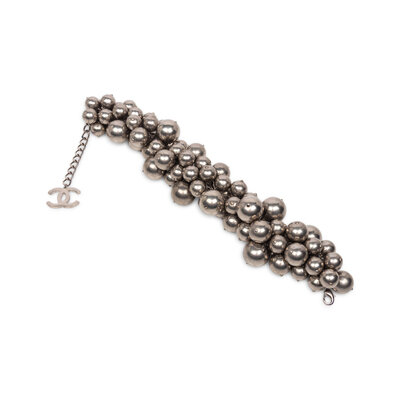 Statement choker necklace in aged silver-tone metal; composed of clusters of various-sized baubles on a chain, with a dangling CC charm at the end. Lobster claw clasp closure. Stamped 'CHANEL' on clasp.
