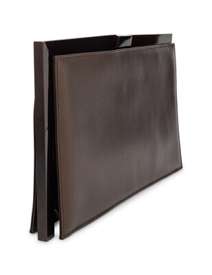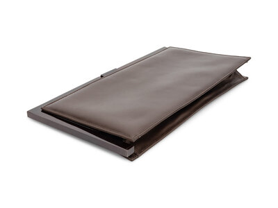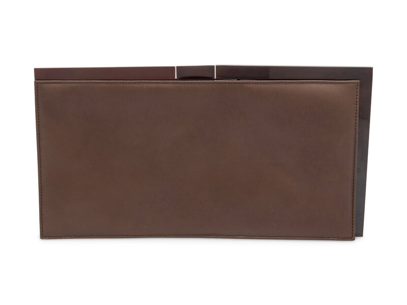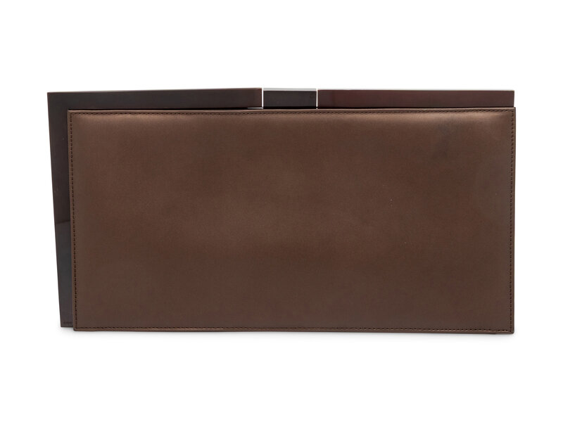 Flat clutch bag in bronze-colored smooth calfskin leather with polished tonal metal hardware. Push-lock frame closure.