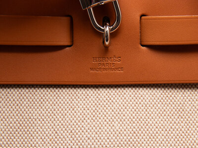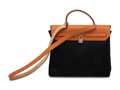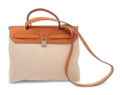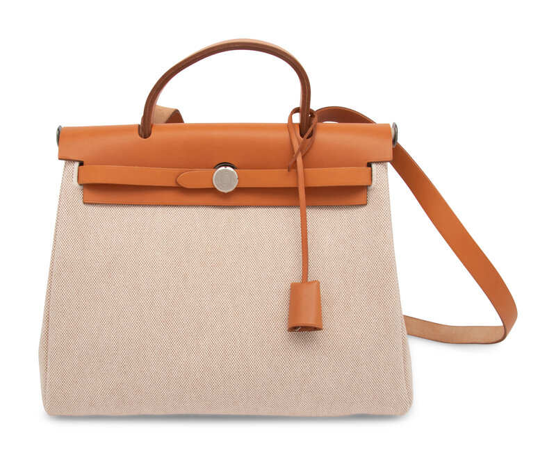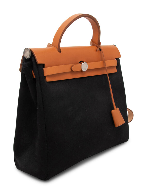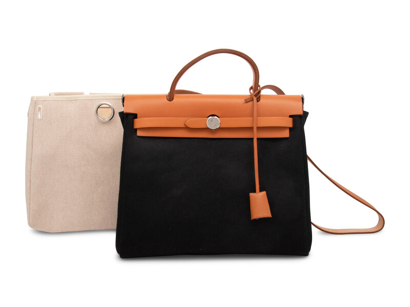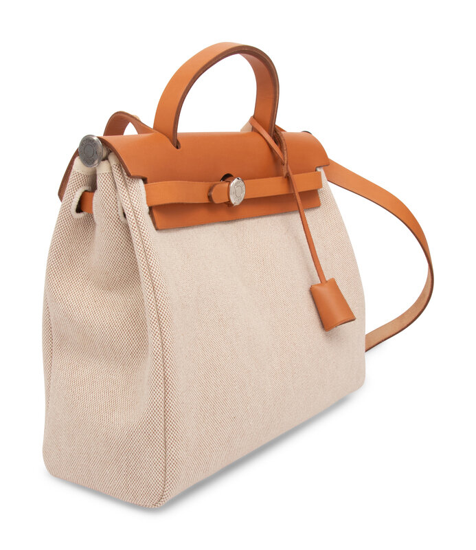 Herbag 31 in light brown Vache Hunter leather with cream Officier cotton canvas and black Officier canvas bags; with palladium hardware.