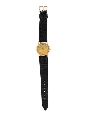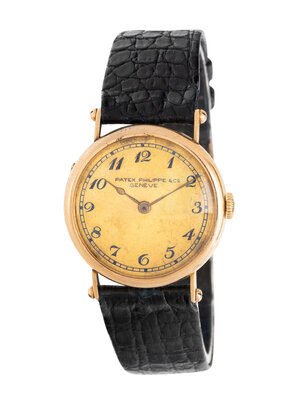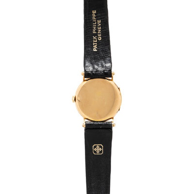 Bracelet/Strap: Black leather signed Patek Philippe with 18K rose gold Patek Philippe buckle