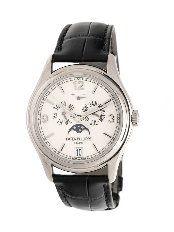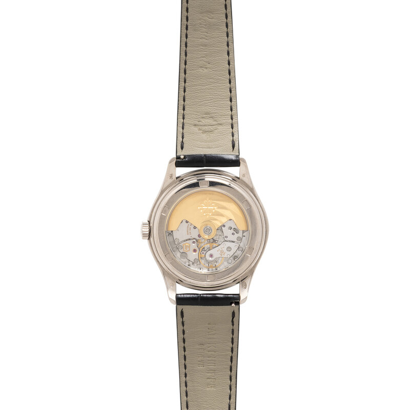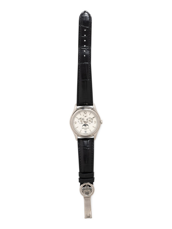 Bracelet/Strap: Black leather with Patek Philippe 18K white gold deployant clasp